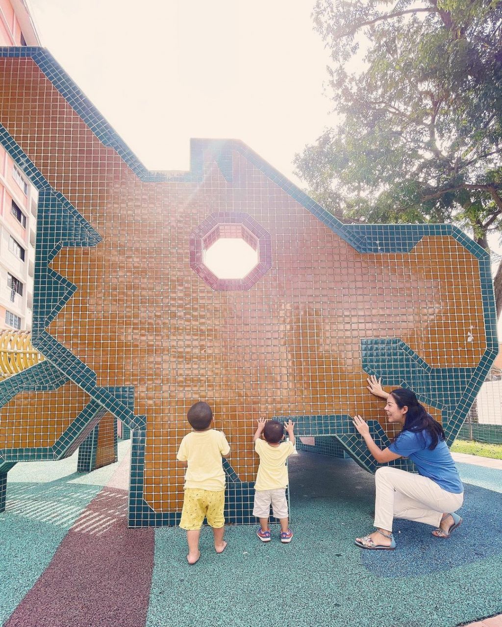 带有年代感的石砖贴面+钢架游乐设施