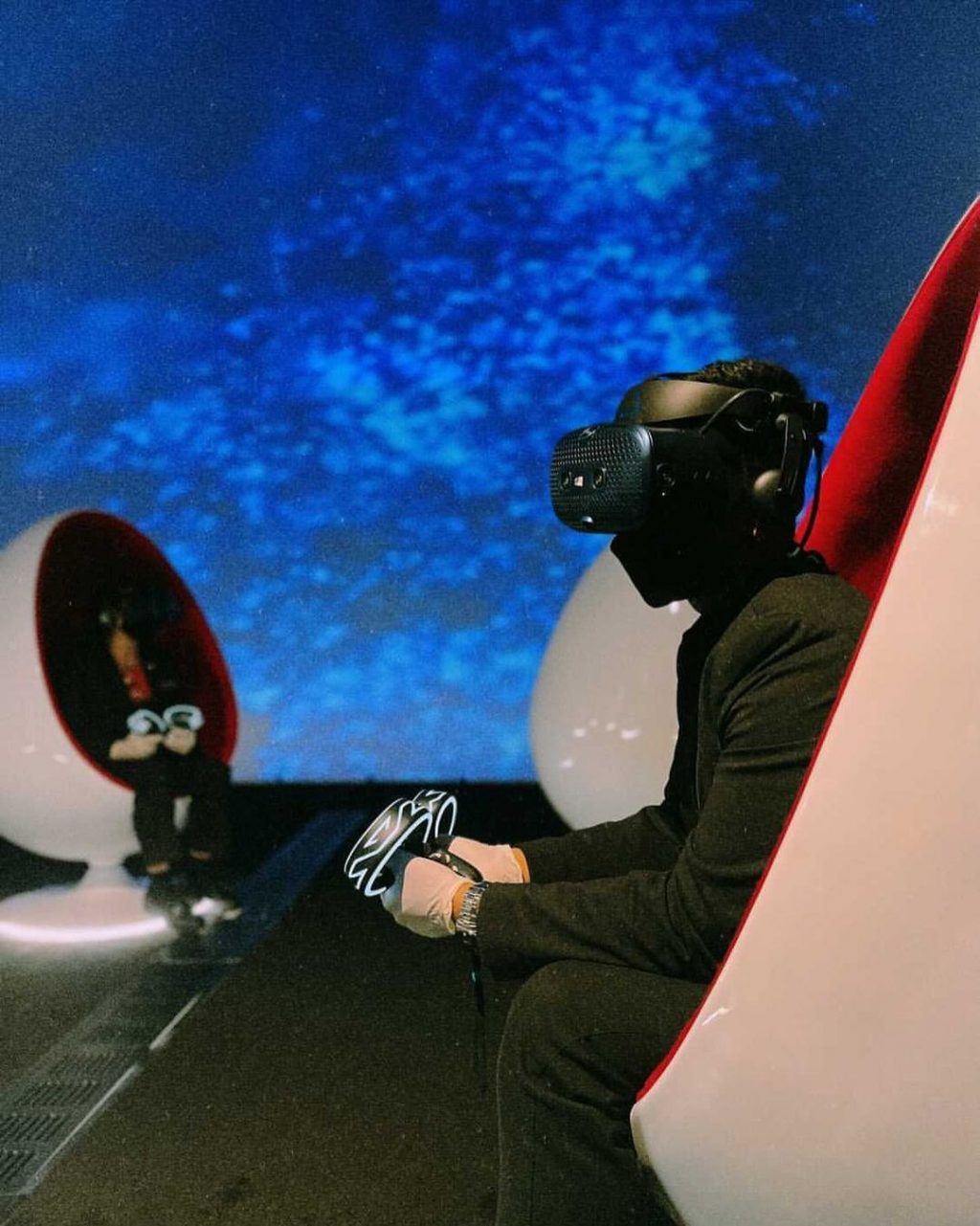 戴上VR头盔并坐在蛋舱里
