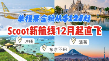 Scoot酷航开通新航线!12月起直飞清莱、冲绳、东京羽田!单程票含税从128新起💰Scoot酷航宣布将会开通新航线!从新加坡飞往泰国清莱、日本冲绳及东京羽田的航线将在今年12月开始提供服务 更多...