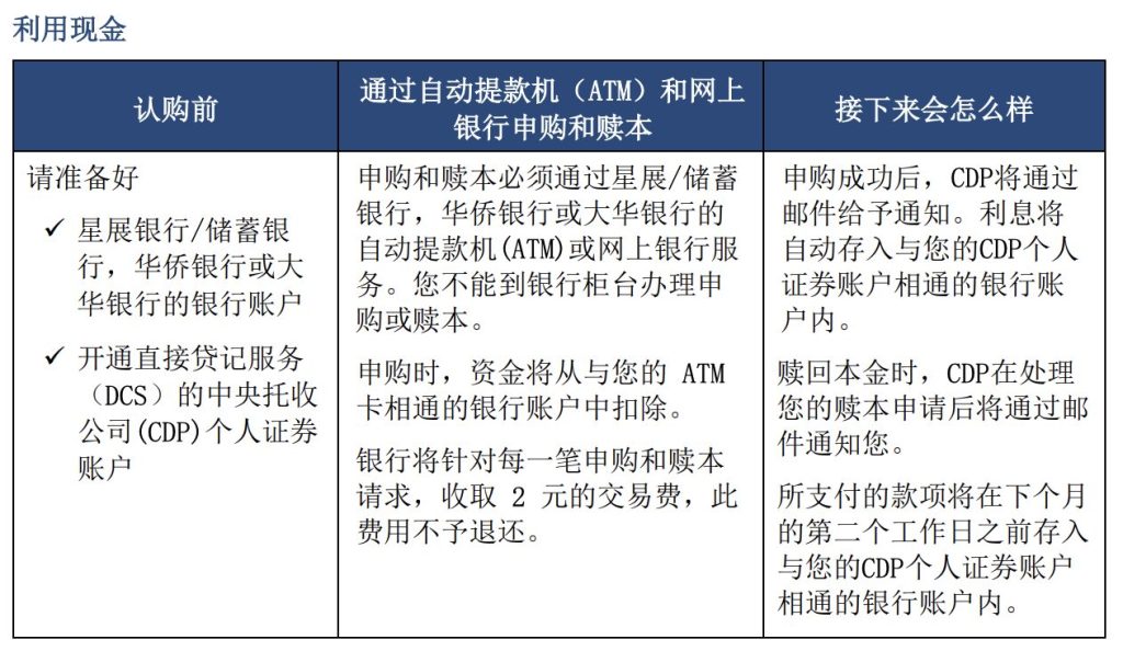 申购和赎本必须通过DBS/POSB、OCBC、UOB的自动提款机(ATM)或网上银行服务