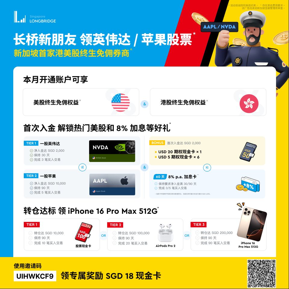 🇸🇬 火遍香港的长桥证券来新加坡了!免费送300新币,含英伟达/苹果股票!存款还额外送加息券,确保8%收益!
