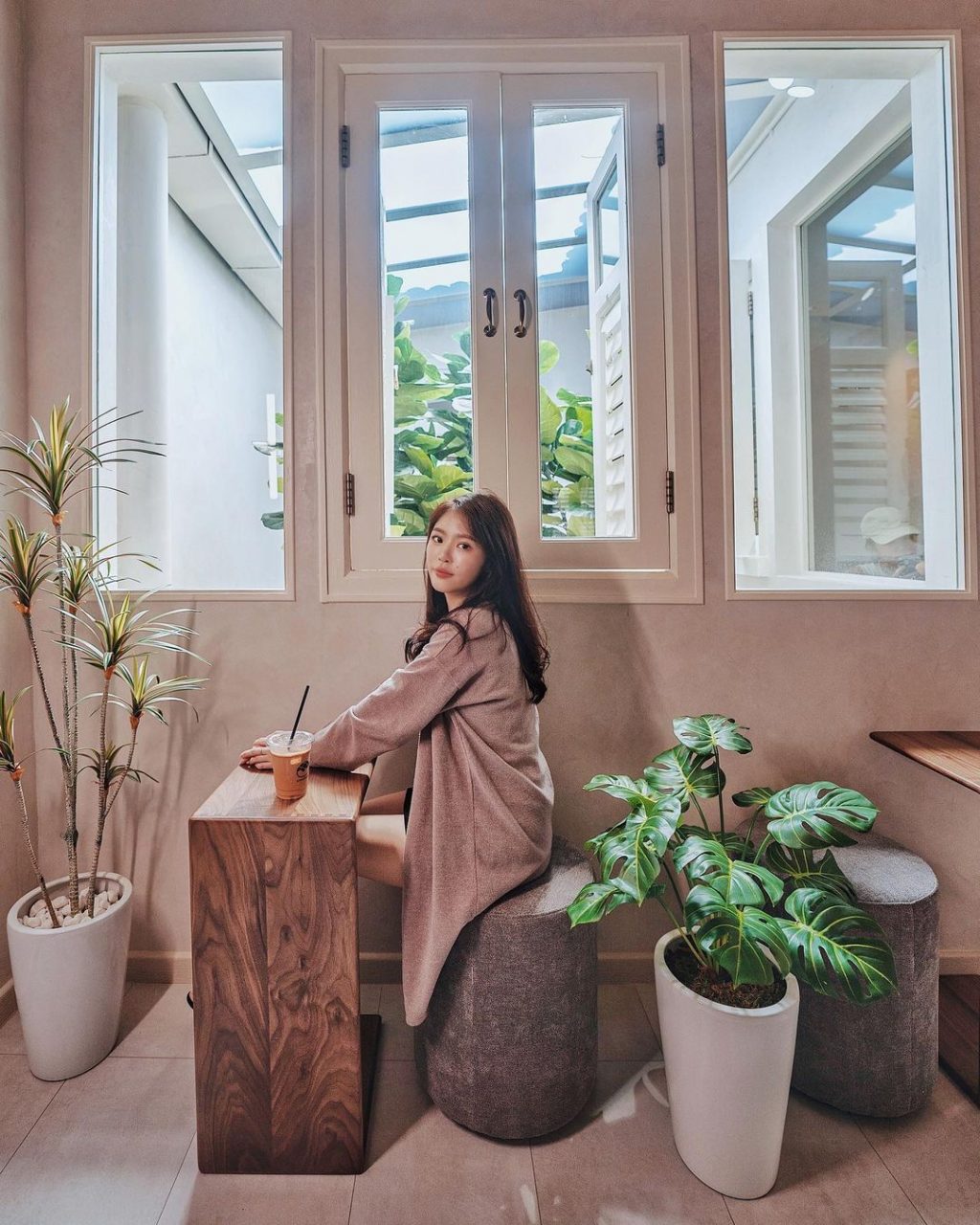 搭配绿荫植物与木质桌子