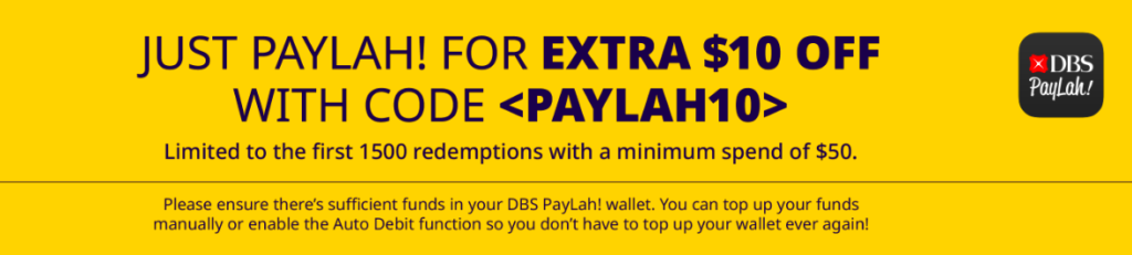 消费买S$50的前1500名用户使用PAYLAH付款输入折扣码【PAYLAH10】即可再减S$10