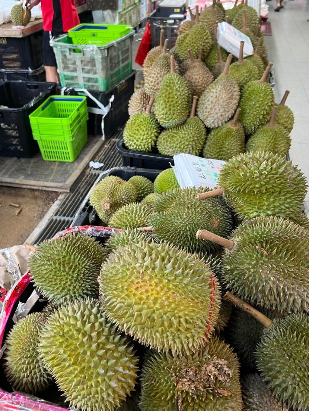 新加坡街边卖榴莲的摊子也陆续多起来了