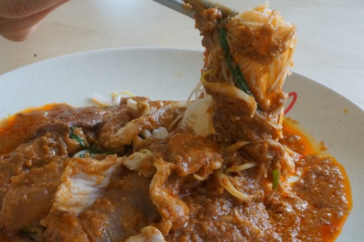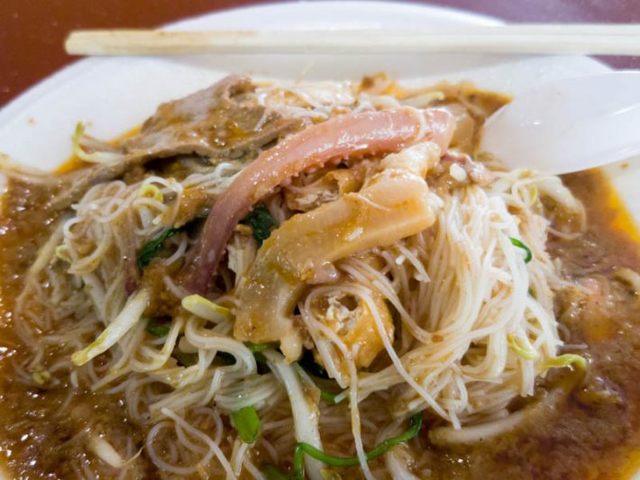 厚厚的一层沙爹酱,鲜嫩多汁的猪肉片,爽滑劲道的米粉……
