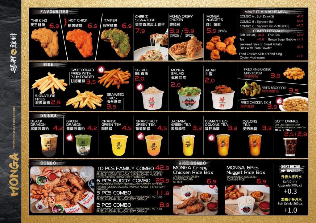 卤肉饭(S$5.8)、蚵仔炒面(S$5.8)、葱油饼(S$4.8)、盐酥鸡(S$7.8)等等