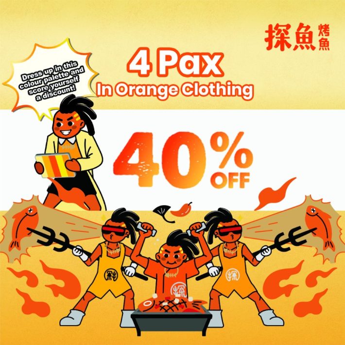 四人穿橙色衣服用餐,可享受40%off、