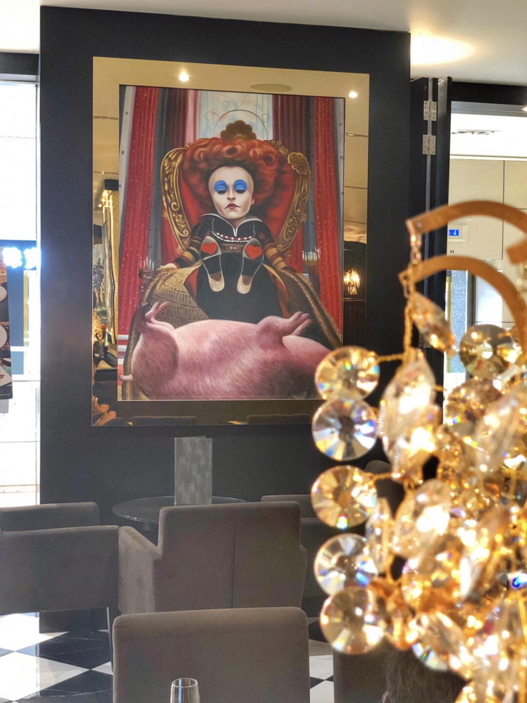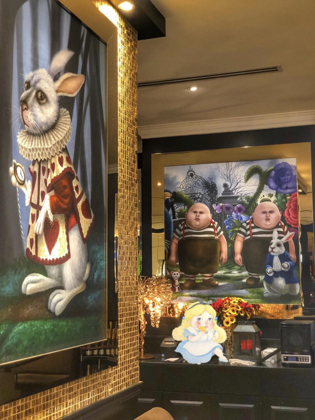 吧台正中央摆放着超大幅疯帽子壁画