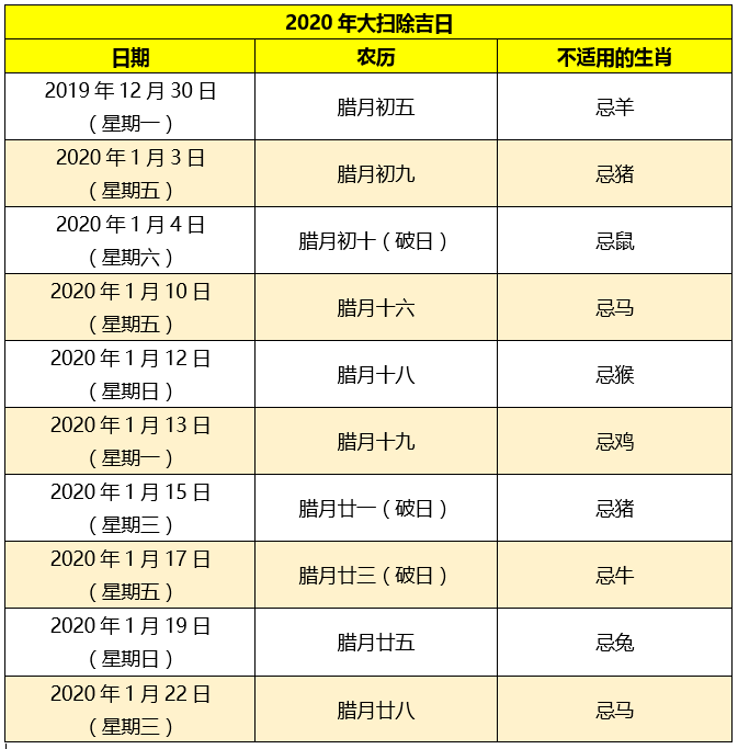 2020年春节前的大扫除吉日也在日前新鲜出炉啦