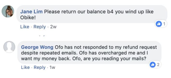 ofo新加坡Facebook上也出现众多之前退押金未果的用户留言