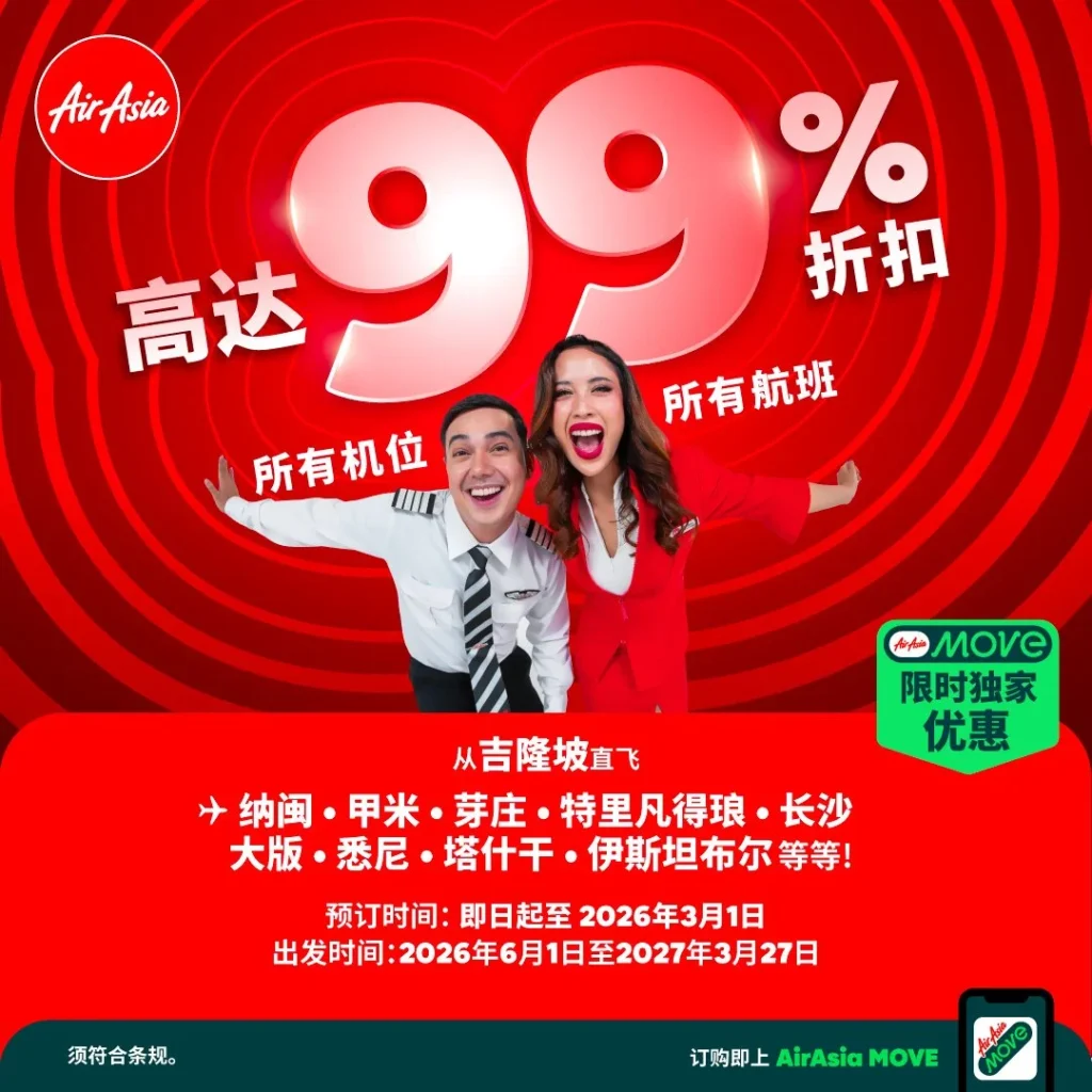 想出国的快看!亚航AirAsia史上最猛99%折扣,从吉隆坡飞全球✈️3月1日截止购买,明年旅行全靠便宜机票回血!