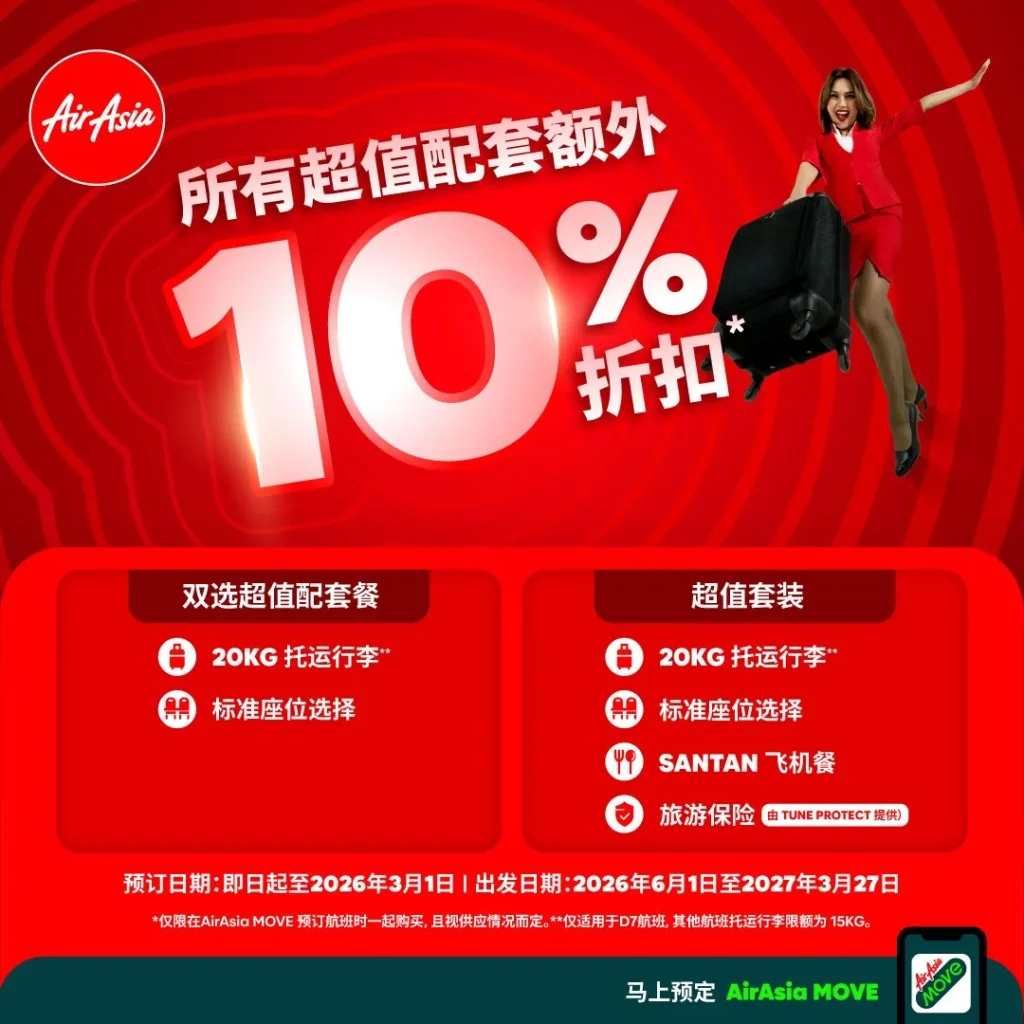 乘客可通过亚航官网或 AirAsia MOVE 应用程序进行预订👇