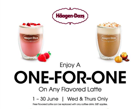 哈根达斯推出买一送一,所有口味的Lattes都参与,时间仅限本月的每一个周三和周四。午后来一杯Lattes,提神醒脑的同时还能吃到哈根达斯的冰淇淋呢。嗯,择日不如撞日,今天刚好就是周三~