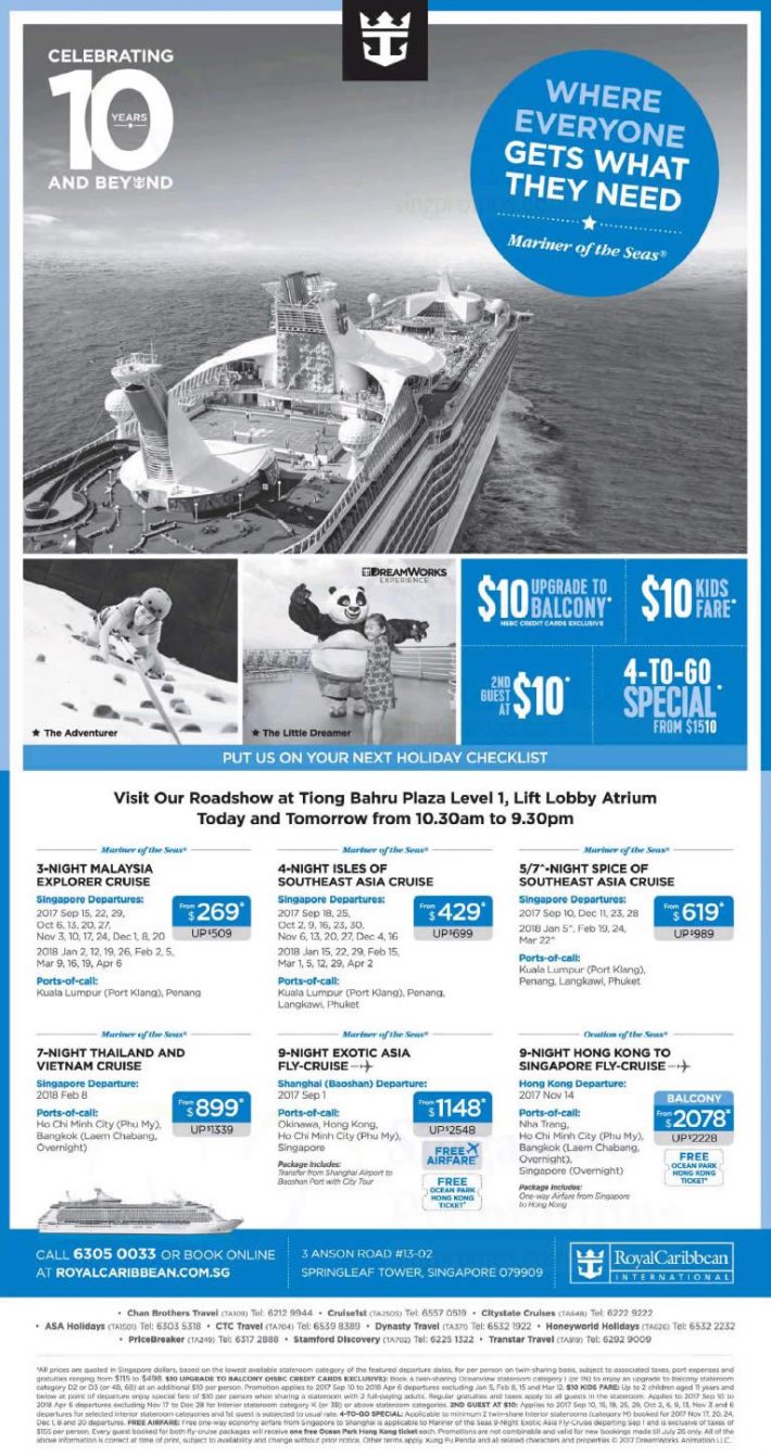邮轮出行不需要订机票和酒店,设施完备,娱乐项目丰富,似乎比自由行来的更加省心省力。皇家加勒比号的大促路演这次来到了Tiong Bahru Plaza。令人鸡冻的是,恰逢10周年,所有预定出行的顾客,第二位只需$10,儿童$10,折扣美丽的让人无法拒绝!行程选择上,有马来西亚三晚 $269起!Couple一起浪的话,算下来人均$150都不到。刚好小长假,我去订邮轮了再见