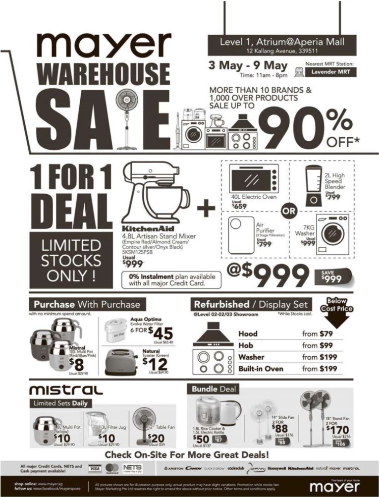 5.3 新加坡优惠合辑 | Mayer大促低至一折,KitchenAid厨师机买一送一;Home-Fix高达2折促销;伊势丹会员10%返现仅限三天;Esprit又打折,80-20/150-30特价商品也可满减;New Balance全场7折;屈臣氏母亲节按摩靠垫71%off;还有IKEA40周年庆一定要去哦~