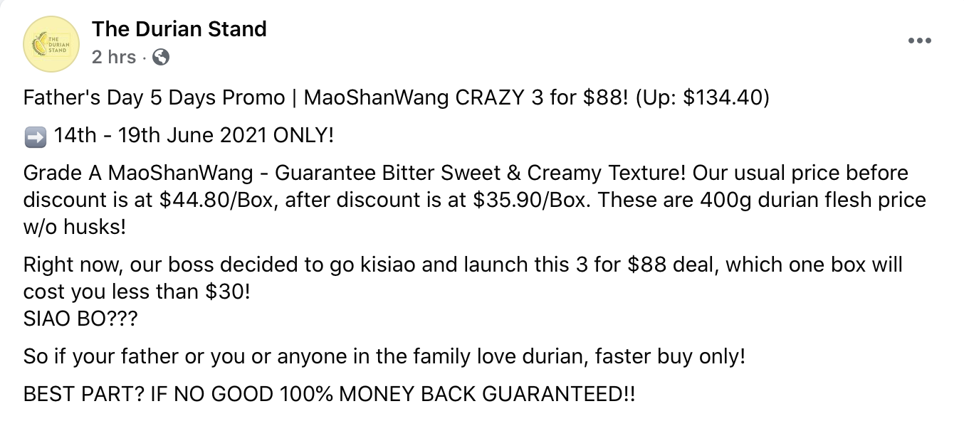 在Durian Stand上消费满150新币可免费送货上门