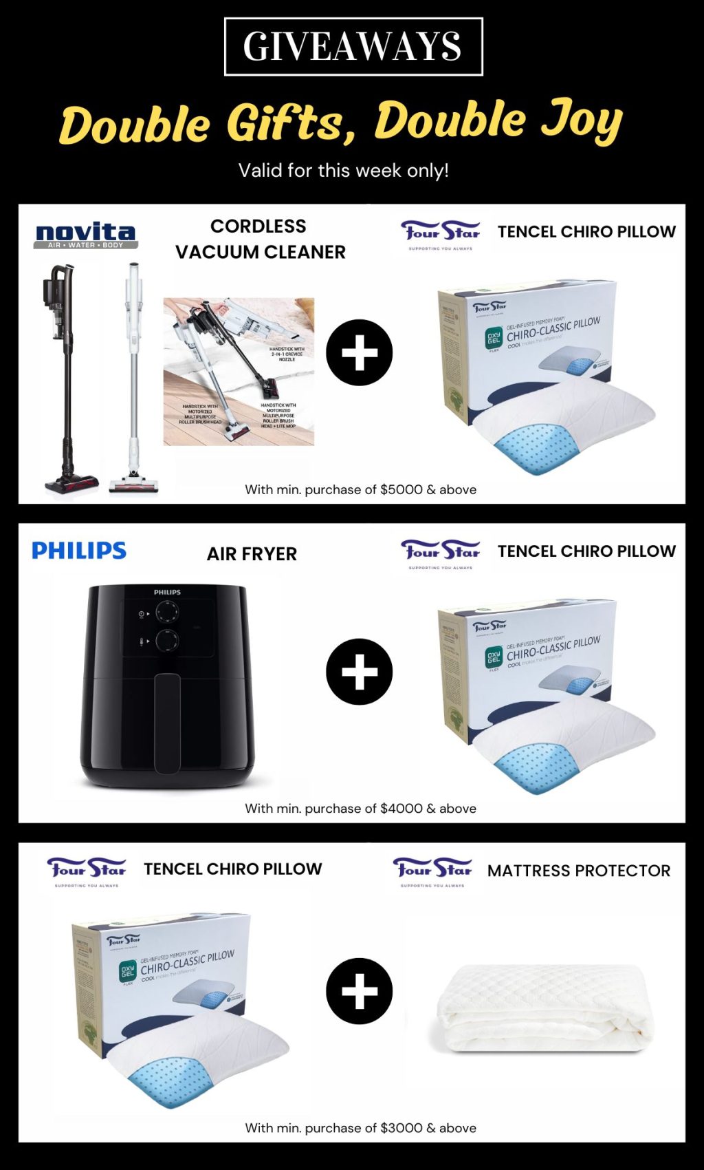 消费满$4000或以上:送Philips空气炸锅+Four Star Tencel Chiro枕头