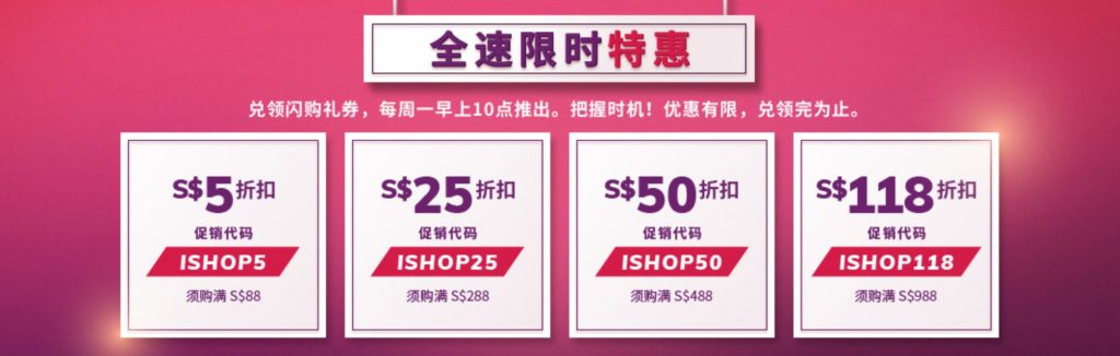 消费满88新币,使用优惠码【ISHOP5】可立减5新币