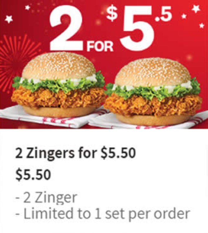 ZINGER BURGERS限时2个只要S$5.50!仅限delivery
