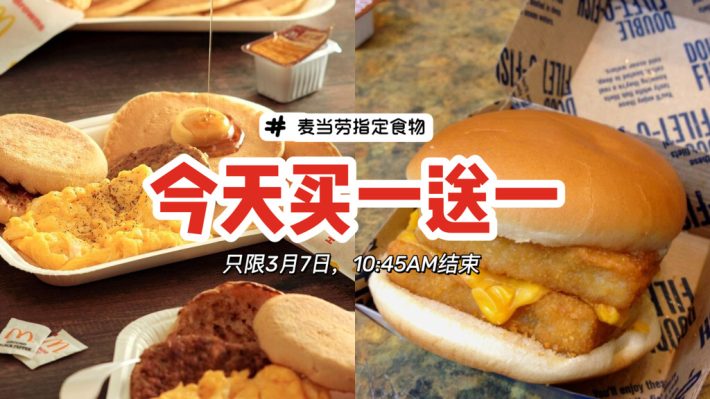 麦当劳双层鱼柳包和大早餐买一送一!只限3月7日,活动10:45AM才结束!快快冲去买🙌