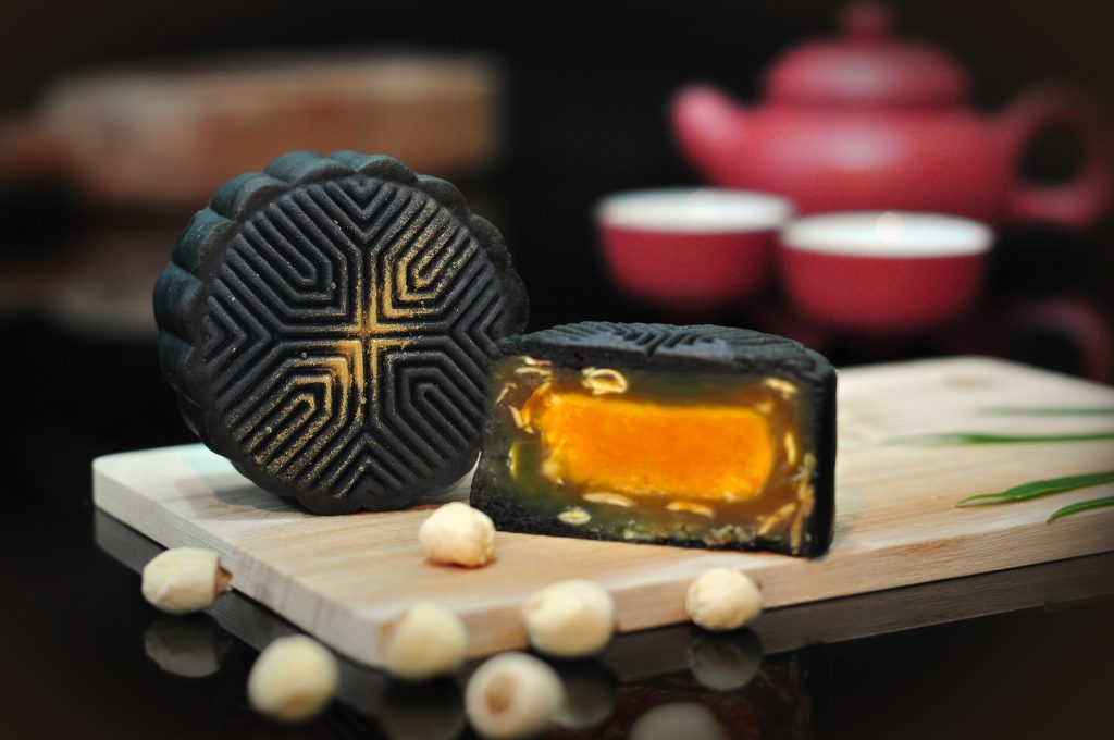 分别是柚子白莲蓉月饼与炭烤黑芝麻月饼
