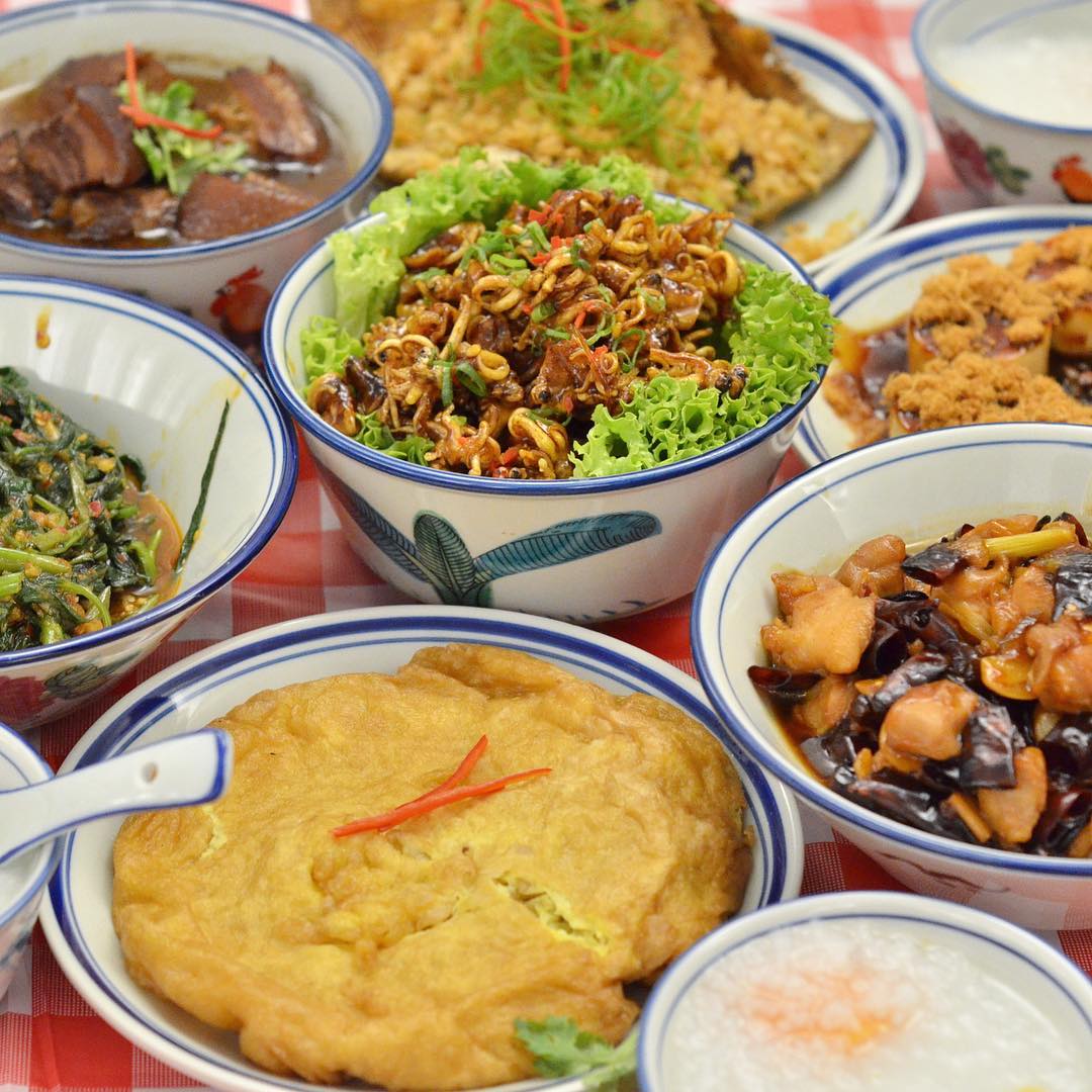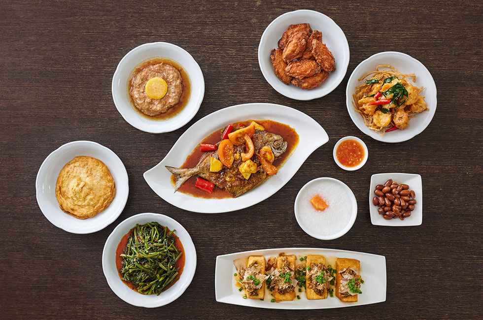 叁峇蕹菜、娘惹亚参香煎黑鲳鱼、麻油鸡、梅菜扣肉等等