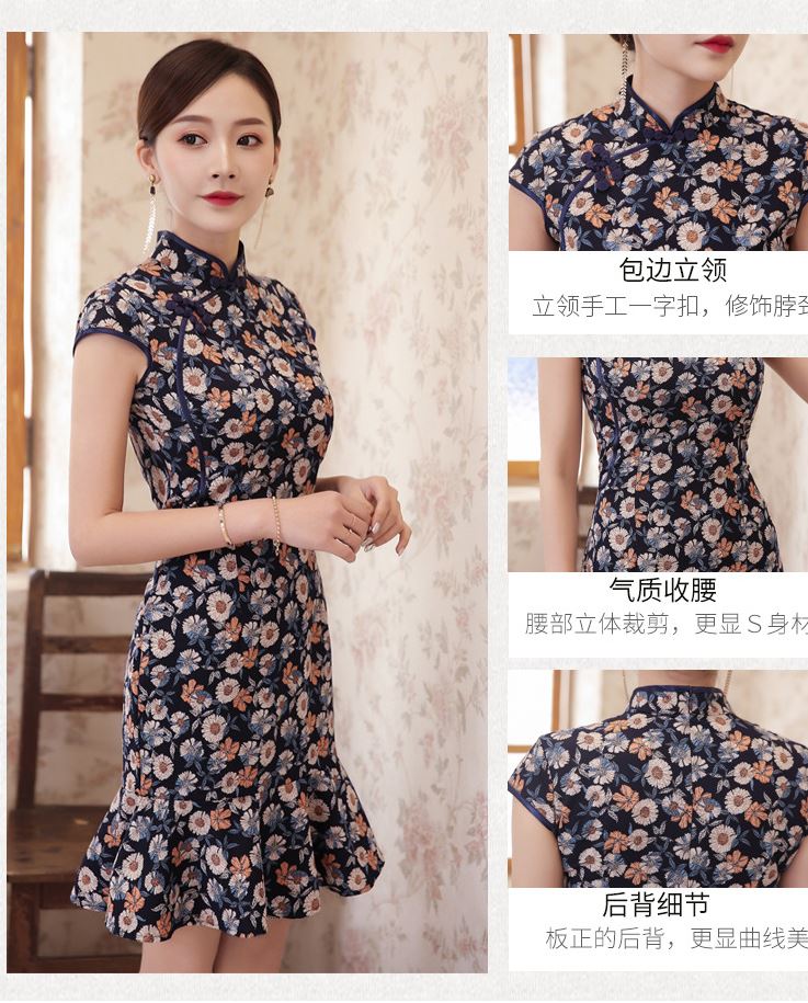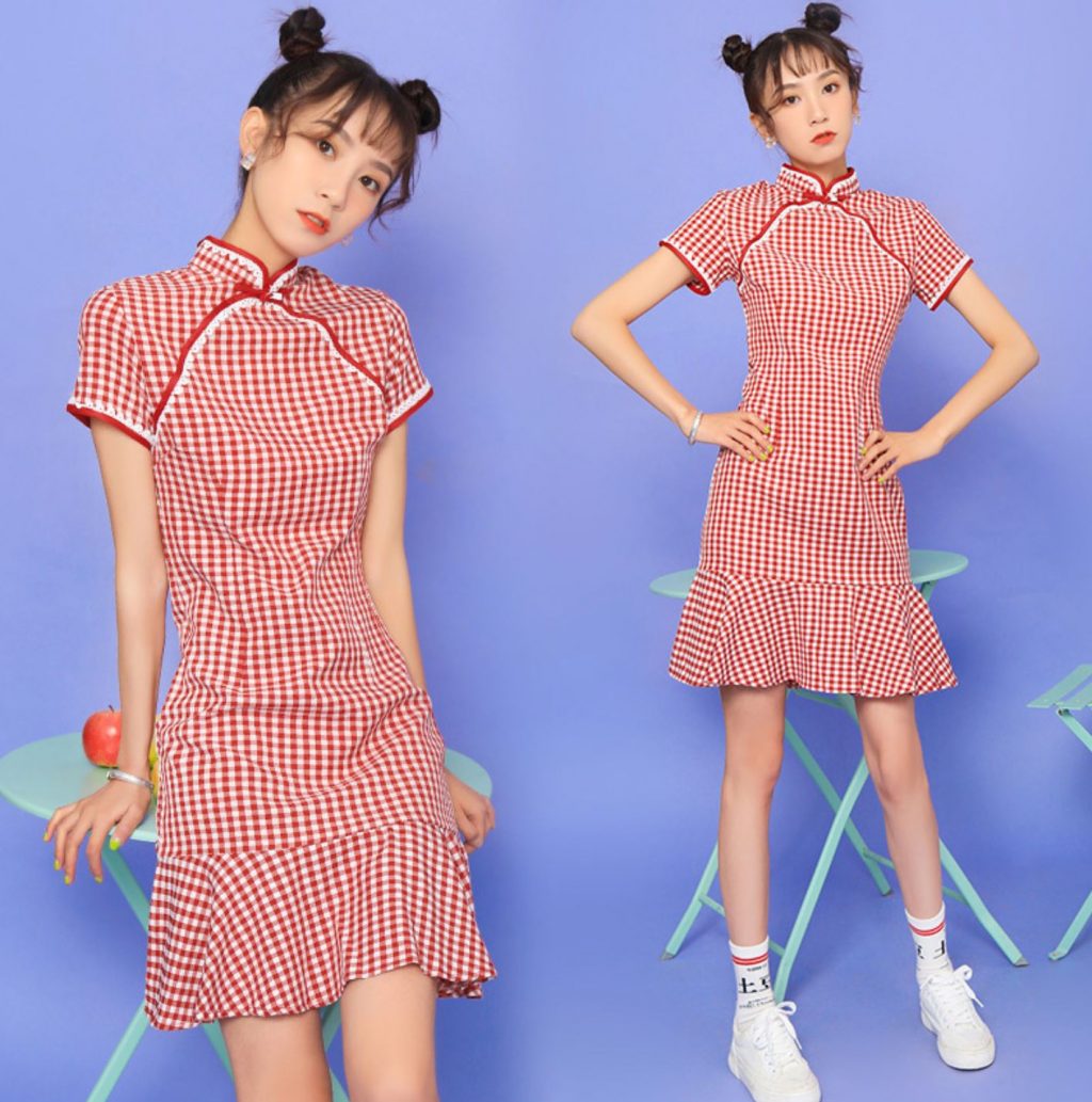 比如说这款文艺复古民国风改良少女旗袍鱼尾格子连衣裙