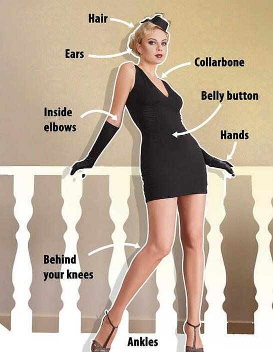 耳垂后方、脖颈 / 锁骨、手臂外侧 / 手肘内侧、手腕、膝盖后方和脚踝上侧