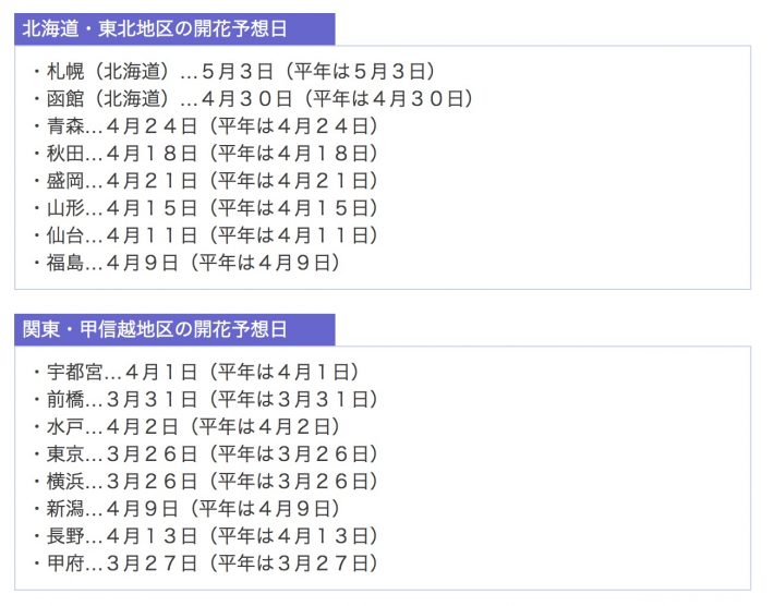 3月22日便有机会欣赏樱花初开的美景,而樱花满开的胜景,则要分别等到3月29日及31日才能见到。福冈大阪、仙台的樱花则紧随其后依次绽放,北海道地区直到4-5月才会陆续开花。